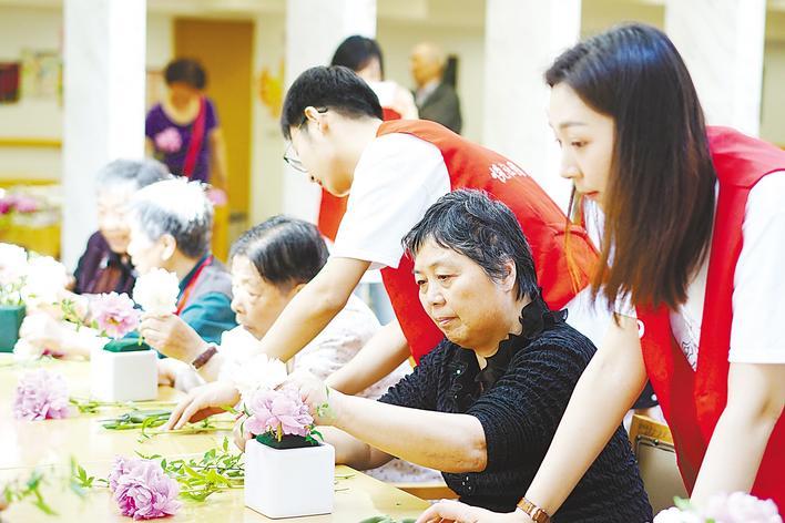 咸宁市西安区中医医院医疗护理中心的老人参加插花活动。 (湖北日报通讯员陈晓红供图)