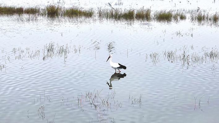 ``在 t此刻,这只鹳鸟在空中盘旋了几圈才落地。 “它在浅水中默默行走,低着头寻找食物。”万阳地管所工作人员毛翔介绍,鹳鸟夏季在北方繁殖,10月至次年3月迁徙到南方越冬。“宜城市的湿地环境和丰富的鱼虾资源,为它们提供了理想的栖息和越冬场所。”